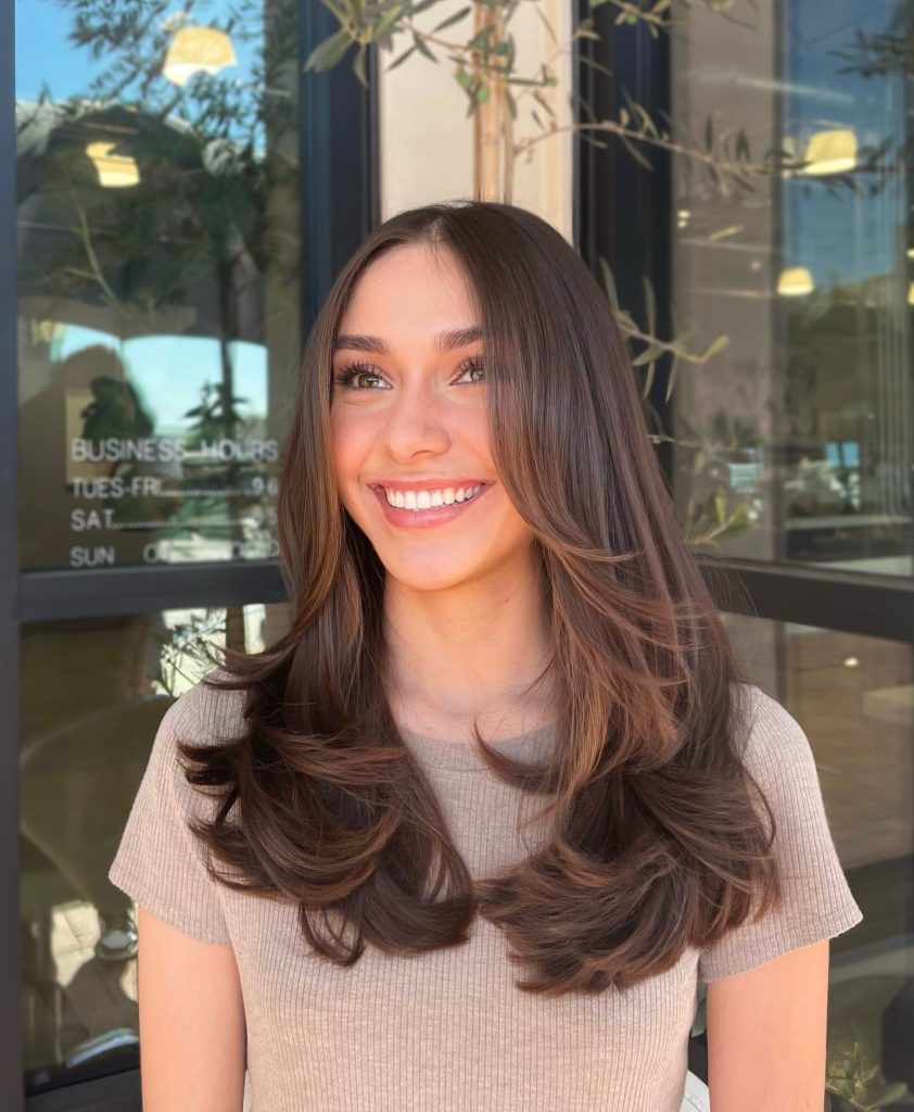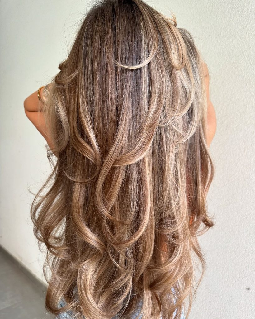 Loose, wavy, and soft curls are the stars of this long layered cut while highlighted strands of hair scatter depth and dimension throughout it. The curls are super soft and bouncy, making this a good choice for thick hair that needs both volume control and definition. The sun-kissed highlights add to the layers and create a golden effect on the hair, thus making the whole look bright. This hairstyle can be donned on both casual and formal occasions, is versatile, and gives a playful yet polished impression.