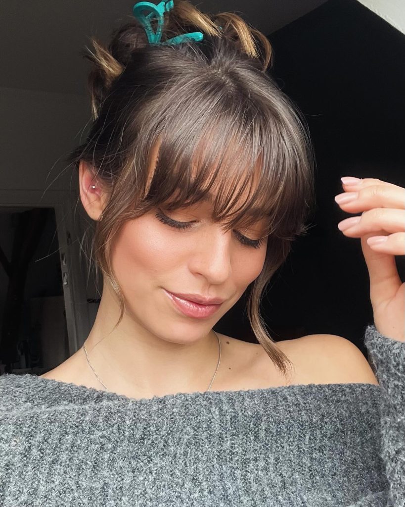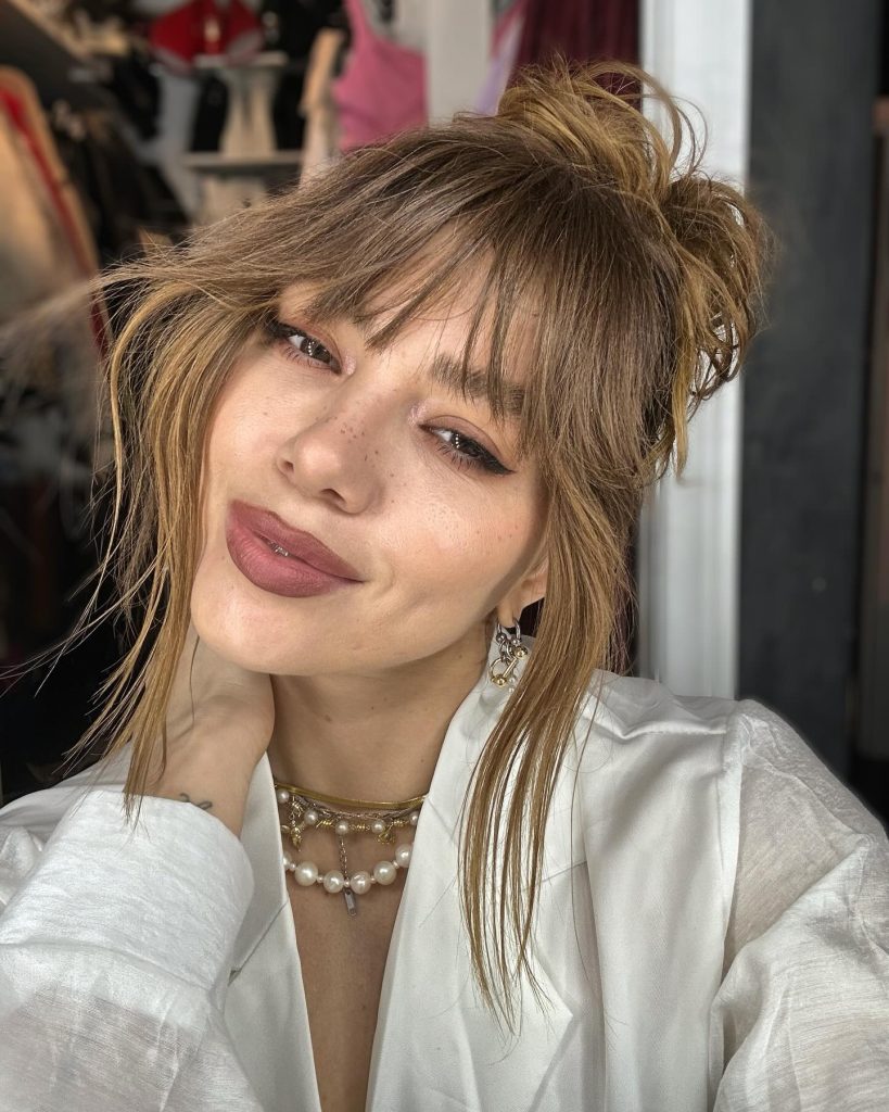 This hairstyle is a very cheerful and elegant hairdo with the bangs being loose and textured which directly notes the face. The look is a great union of casual and chic making it perfect for both everyday and more elegant events such as a laid-back summer get-together or even a wedding. The bangs are cut in a wispy way which makes it look soft and cute yet it gives the hairstyle a natural baddie vibe. Ideal for women with medium to long hair, this updo is a great option for those who want to keep it simple yet stylish. Also, this hairstyle can be topped up with fancy statement earrings that will take the overall look to the next level of elegance.