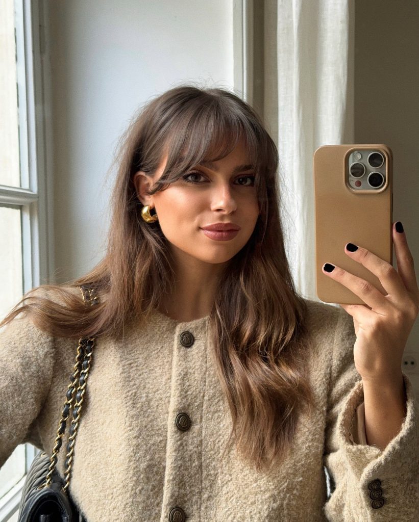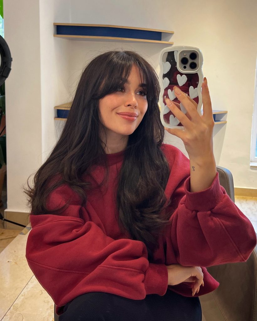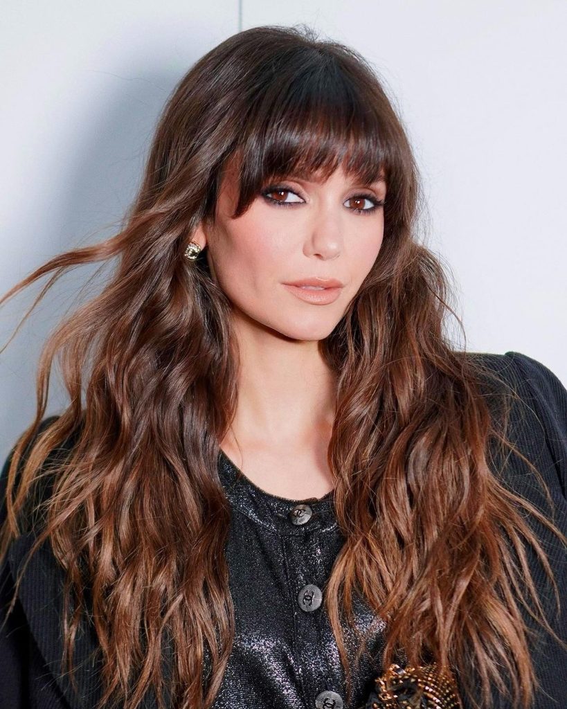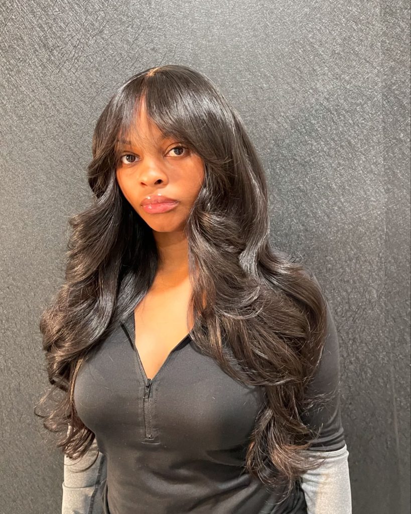 This type of hairstyle is made mainly of loose long waves and side fringes, and they give a romantic and bohemian feeling together. The full fringe is sure to focus the attention on your eyes, while the waves bring some extra texture and volume making it perfect for those females with long hair who just want a trendy yet low maintenance look. The style can be the perfect match to your baddie style and it goes with formal and casual dresses where you wish to leave an impression in the presence of others.