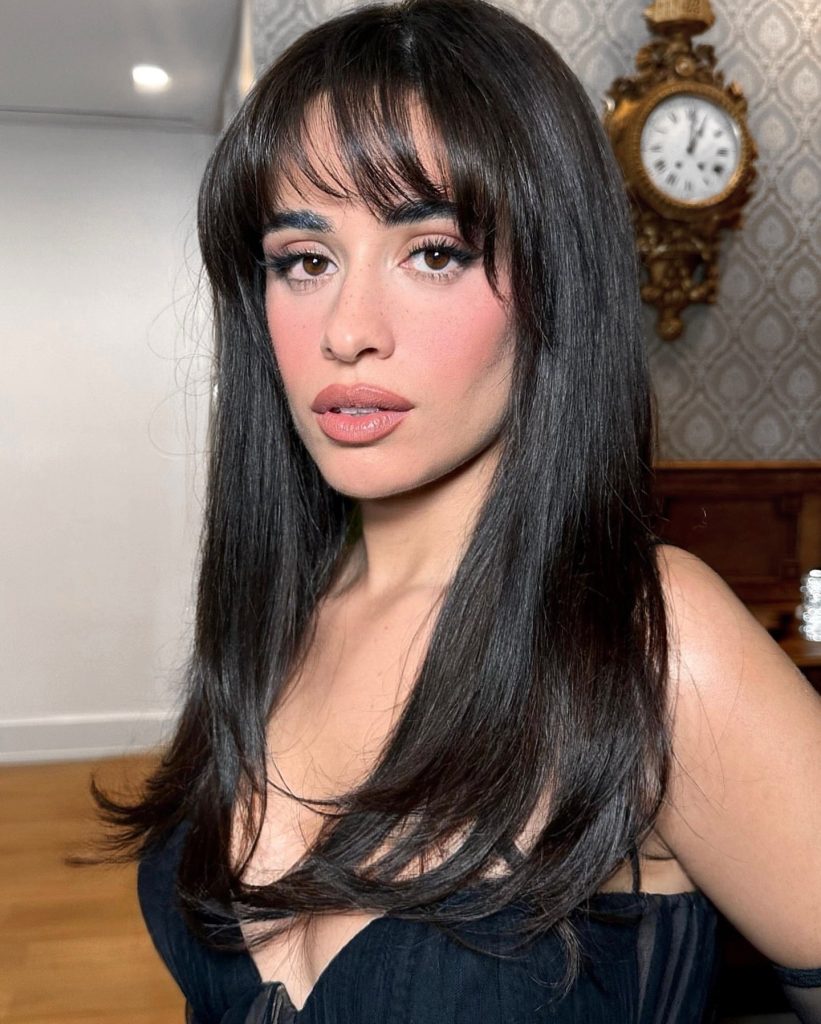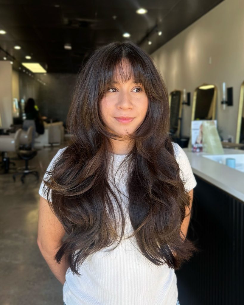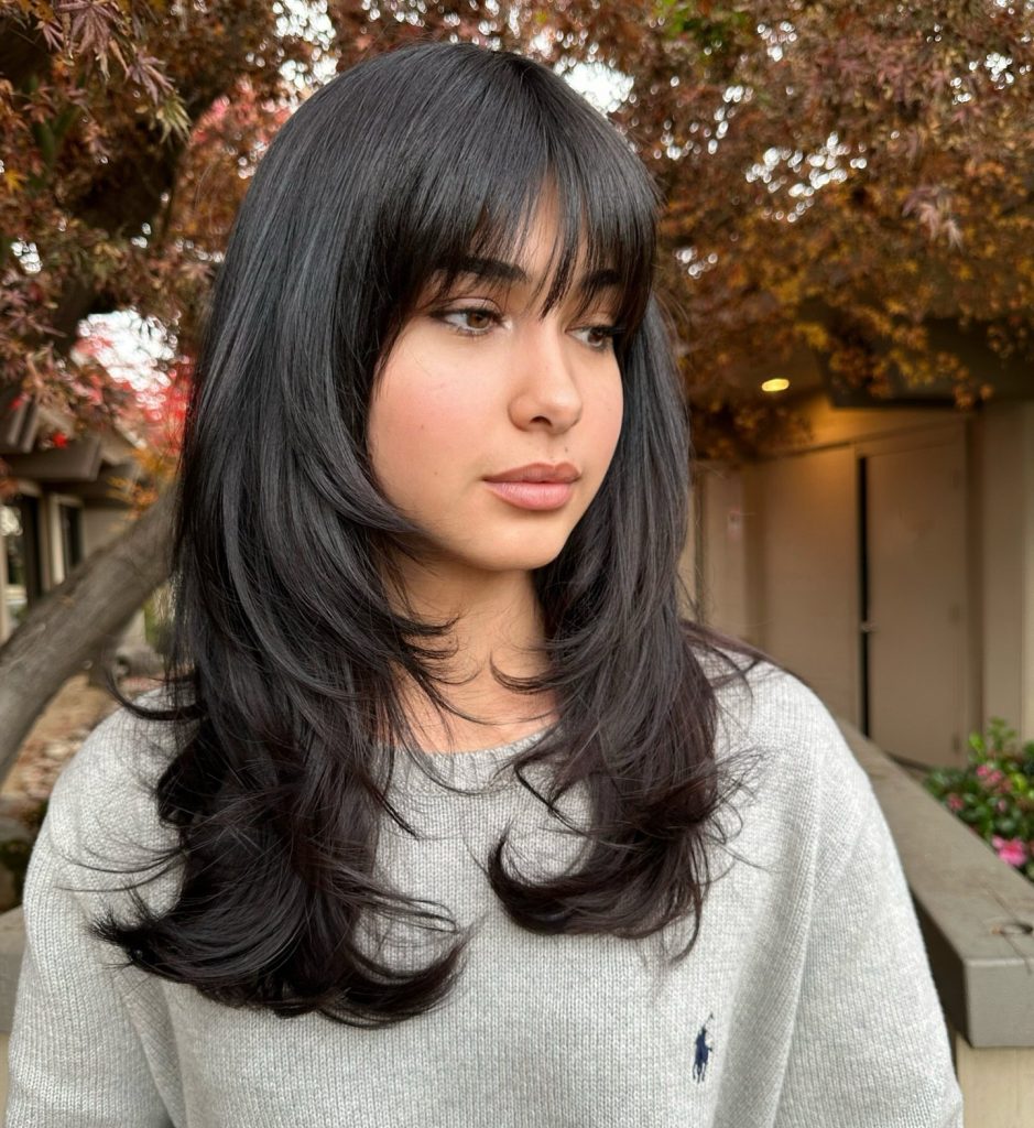 The soft bangs in this sleek, dark hairstyle blend nicely with the layered ocean waves that float on top, which also serve to add volume and class. This haircut is ideal for shoulder-length straight to long hair and it looks amazing especially on black or dark hair. The addition of the layers contributes a bit of drama and it is consequently appropriate for both classroom and festive occasions. The bangs lightly enclose the face forming a good balance and an elegant look that is low-maintenance. People who want to show their true beauty through a classic, refined appearance will find this hairstyle a perfect match.