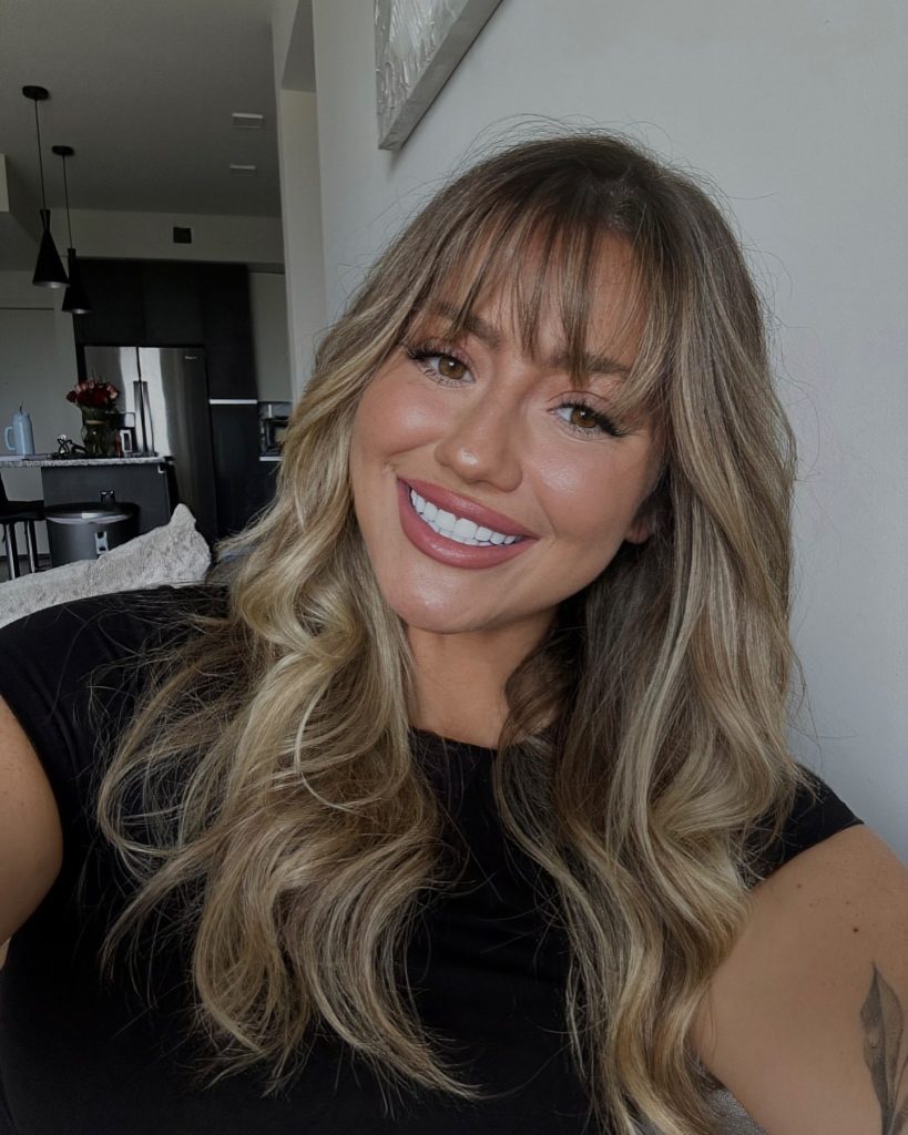 The layered,wavy hair full bangs are flowing to the model creating a harmony and a balanced look. It is an excellent option for the ladies that have medium to lengthy hair since the layers not only make the hair look full but also the bangs are neatly brought to the face. This hairdo can be made more elegant for special occasions or just be put on casually, thus, it is very much multifunctional and easy to style. The soft curls give the plywood effect to the hair that is naturally voluminous and add a cute and friendly look that is suitable for daily outfit. This style is suitable for women who want a casual yet stylish look that goes well from day to night.