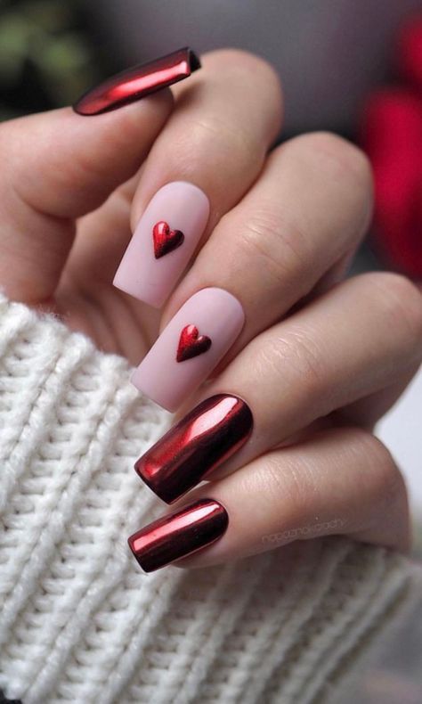 Standing out like a star on the stage, this metallic pink nail design is the one to advance to the next level. This has a single almond-shaped nail which is decorated with a soft nude base and a raised pink heart, hence, it has a playful yet elegant twist. The shiny metallic surface adds an extremely bright color to the mood, which makes it the main star for Valentine’s or candlelight dinners.