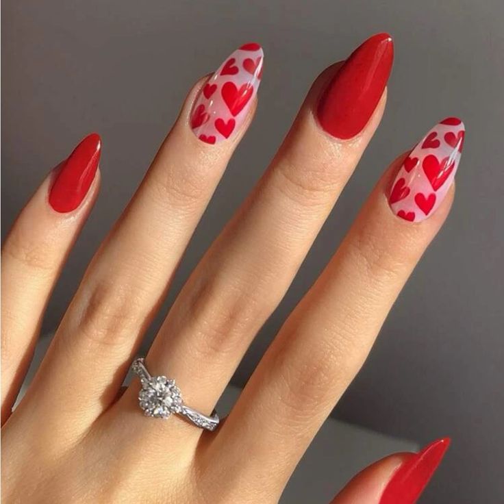 5. Playful Red Heart Pattern on Almond Nails