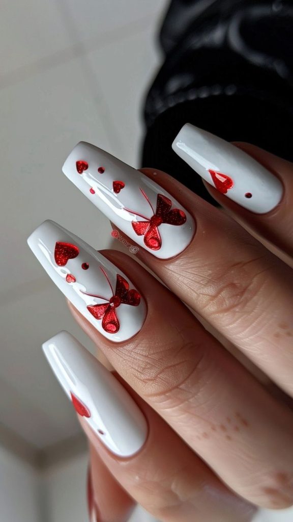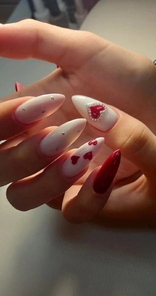 White and red colors with small rhinestones and a sparkling heart embellishment are absolutely romantic and elegant to this design. The almond nail shape is prominent to the soft and feminine looks and it is a real eye-catcher for Valentine’s Day dates. This look is suitable for wearers who prefer an art design that is both intricate and luxurious and it is a great match with evening wear or formal outfits.Furthermore, the detailing of rhinestones is the signature of sophistication, thus, it would be a remarkable choice for a high-class Valentine’s Day party.