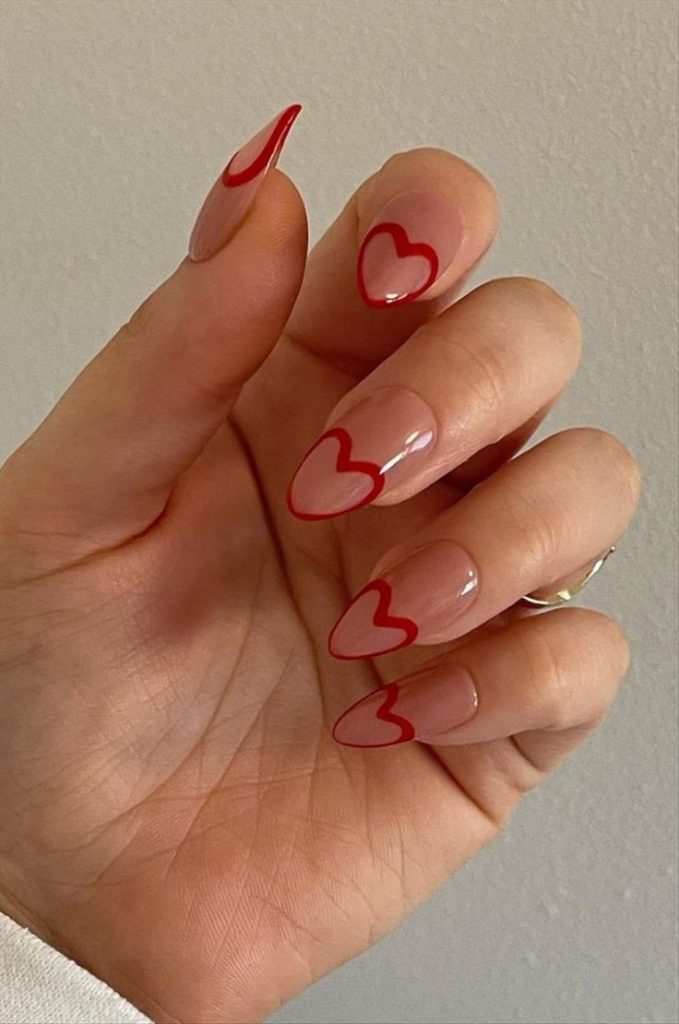 Do you want to add some minimalist nails as your nail art trend? This pattern is just as easy as it can get with thin red heart borders on the without a coat color base that is almost invisible on the nail. The almond nail shape gives it a gentle and wistful appearance while the minimalist design makes it appropriate to wear at both casual and formal events. This design is perfect for people who like neutral aesthetics but also want to honor the Valentine’s theme somehow. Worn with a pastel or monochrome outfit it would highlight the delicate beauty even more.