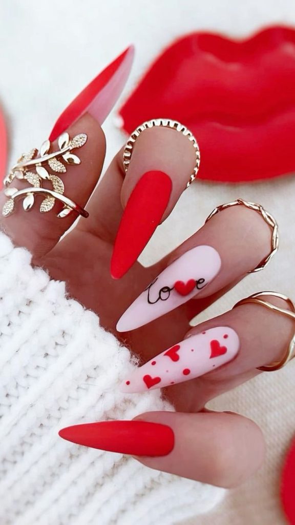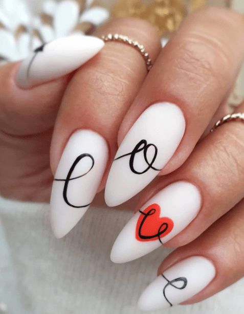 This white matte nails idea radiates an artistic sense of style with its handwritten word “love” and a couple of heart details in red and black. If you are a minimalist lover and want a distinctive Valentine’s art design, then this clean and modern aesthetic is your best choice. The script is borrowed to add an individual and artistic expression, while the matte coloring increases the design’s grace. Besides, it works excellently as a conversation starter with a dress matched with pieces of soft romantic colors or minimal jewelry.