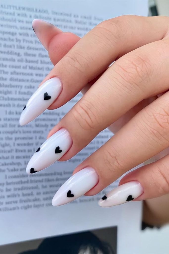 12. Elegant White Nails with Subtle Black Hearts