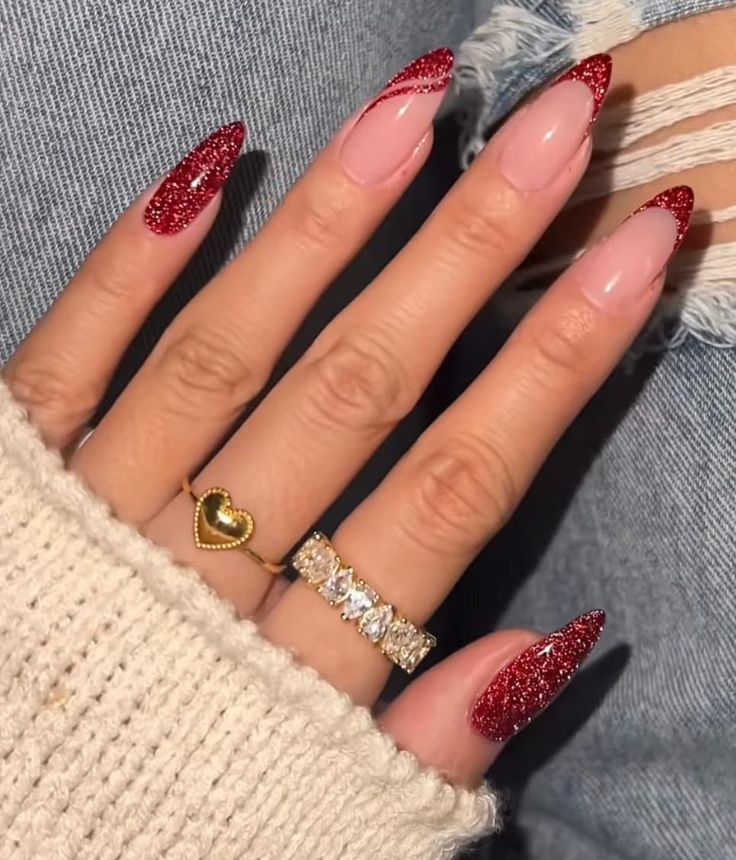 French tips are the ones to get the classical touch. Now with a glamorous upgrade of shining red details, your tips will look very nice. The nude base gets a classic look and the red glitters make it express a daring mood that is just right for Valentine’s Day. These designs can be done on any nail length and they look perfect with both knitted sweaters and evening dresses. If you are the type of person who loves simple designs that stand out, this is a look you just have to try.