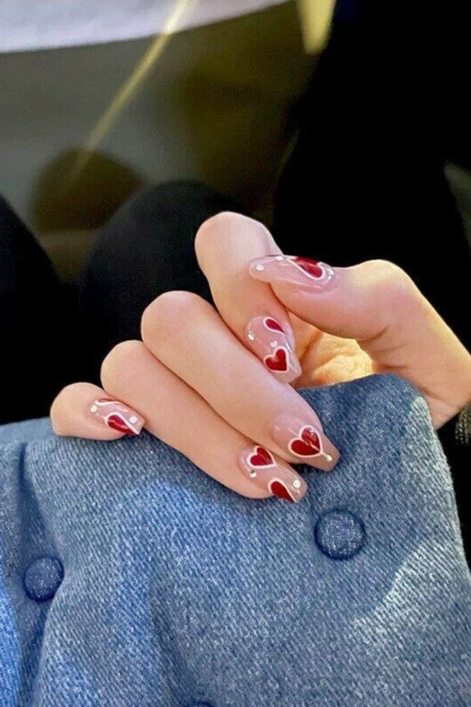 Rhinestones for a chic finish makes this design use vivid red hearts on a transparent base . Small glitters make this style much more gorgeous including depth. These nails which you can wear with any of your Valentine’s Day apparel will be the perfect option when you go for the dinner with your partner or the holiday party.