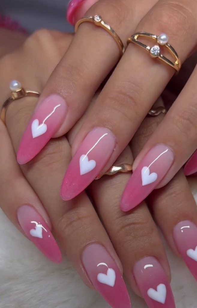 This pink gradient design is soft and romantic, with delicate white hearts on every nail. It is the subtle ombré effect that stays from weakened pink to a more intense color, thus, adding depth and volume. For fashion lovers who are minimalist but still want a feminine touch, these nails are good choices, they look splendid with light pastel clothes or small accessories for an easy preppy Valentine’s Day look.