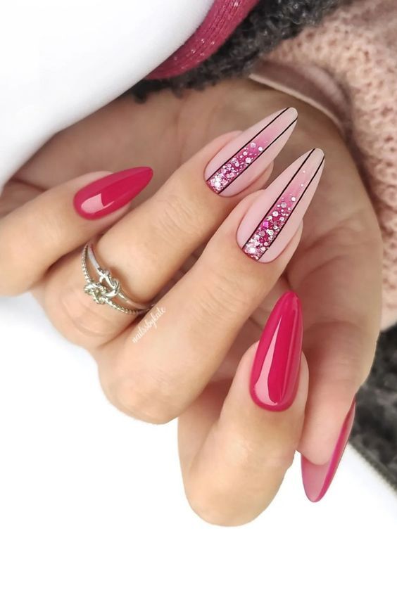 This high-fashion design features glossy pink nails that are blended with a gorgeous accent nail consisting of glitter stripes. The attention-grabbing glitter elements are delimited by black stripes, which results in a contemporary art design. All this sparkling look is perfect for evening parties or special Valentine’s celebrations, providing you with a contrasting yet elegant choice for women that feel like sparks.