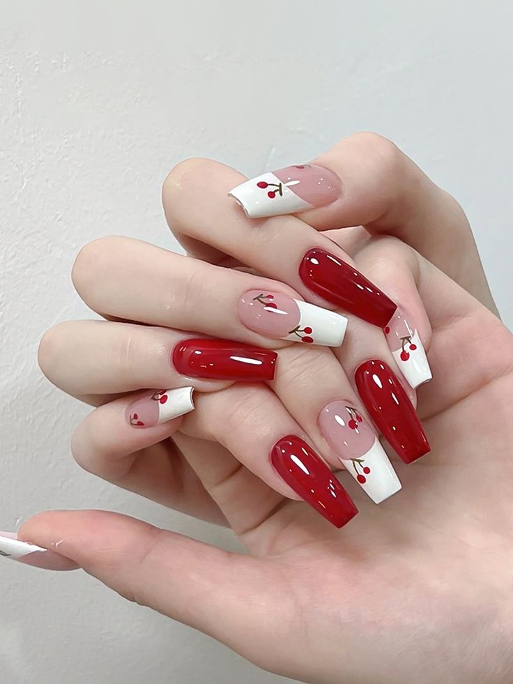 The design unites red and white in an amusing manner with the addition of cherry-like elements on alternating nails. The glossy red and sheer pink bases result in a soft, romantic atmosphere, while the cherry accents bring a playful yet elegant touch. The squared nail shape brings out the strength of the design making it suitable for a Valentine’s Day brunch or any other cheerful gathering.