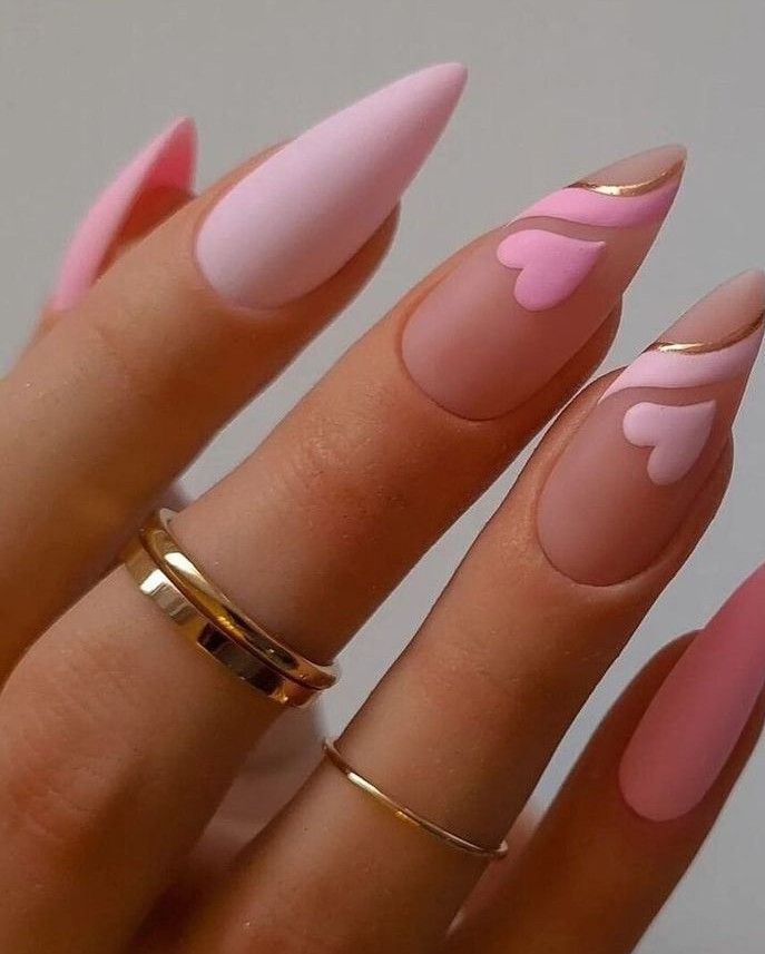 This Valentine’s nail design with a touch of chic and simplicity is a combination of matte pink nails having cute little heart’ details in a contrasting color of pink and gold. The simple gold lines are added to give an opulent twist, making the design richer, and without taking away the simplicity of the art. Mathematically stylish people who like this design will not only look great in it but also will match with the soft neutral outfits giving a unified look to the style.