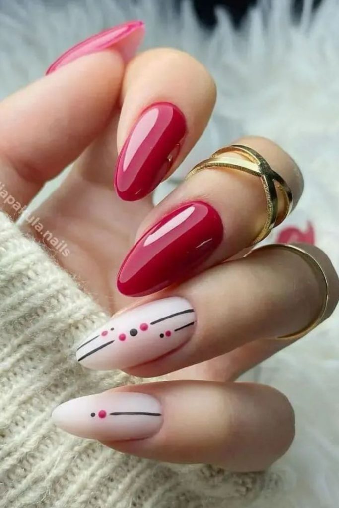 The contrast between refined charm and brightness is very well characterized by this nail design, which showcases a combination of solid bright red and sheer pink base nails with small floral designs. The gentle white and red flowers along with it present the design in a very fresh spring atmosphere, which makes it suitable for the women who would very much like to festoon the serious romantic love of Valentine’s Day with a cheerful touch. The almond nail shape is a unique feature that adds to the overall femininity of this look, which is simply charming for workplace gatherings or casual strolls.