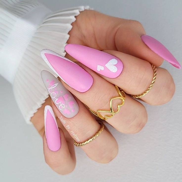 Matte pastel pink nails look absolutely professional with the white shining heart decorations are wonderful. The exceptional one is the colorful accent nail that has the word “love” accompanied by fine pink patterns and glitter. This design is particularly for the ones who like to demonstrate their own style by means of Valentine’s joy on their nails. Besides, this charming style is great with pastel clothes and gold accessories, which makes it simple and elegant.