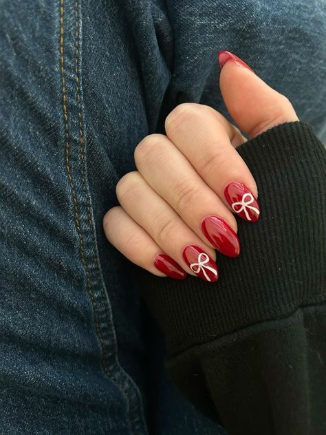 28. Glossy Red Nails with Bow Accents