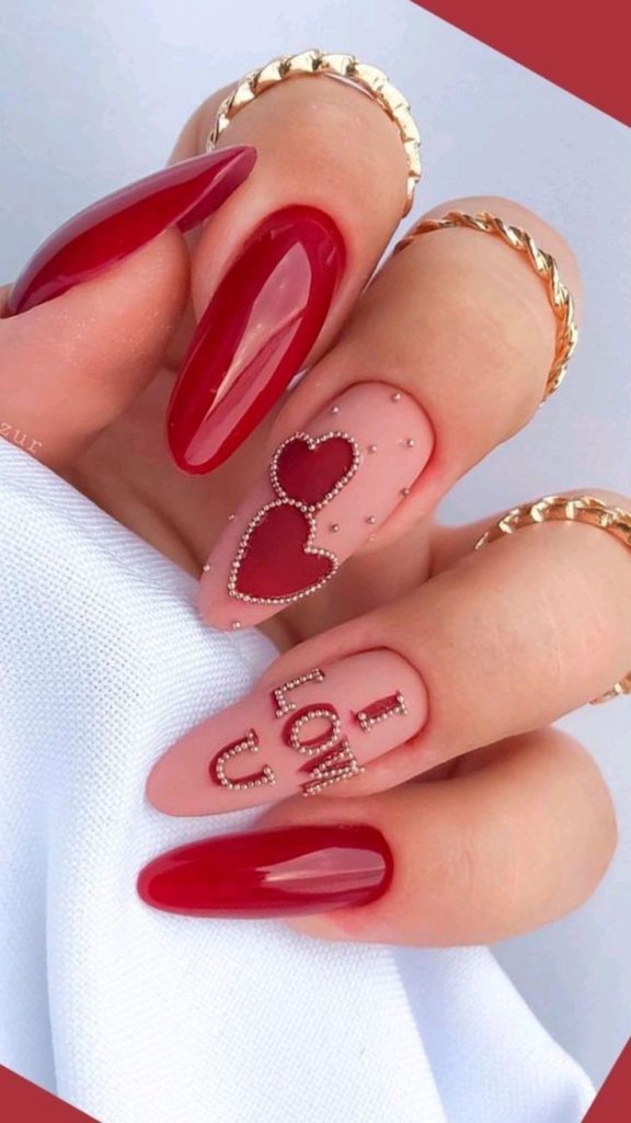 Lighthearted, vibrant, or these bright red and pink colors are combined with the interchanging heart shapes and a”love” script accent, this design is an exception. The almond nail shape denotes the femininity of the design, while the plentiful colors disguise the look as fun and fresh. One of the most suitable options for people who want to join the merry vibe of Valentine’s Day is this style. The coupling of courage and complexity in this case reveals the fabulous choice for every holiday.