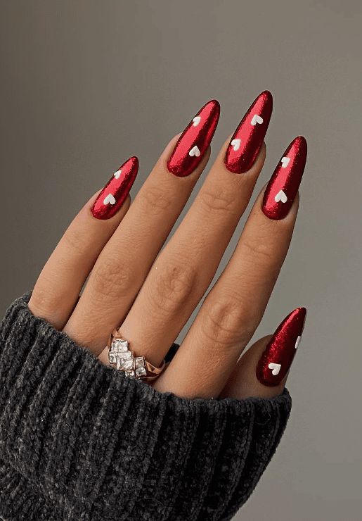 The metallic red design is aimed at people who want to show off their thoughts. The reflection of the material makes it feel like a luxury, and the tiny white shapes of the heart scattered on the nails give it a fun Valentine’s element. This design is easy but attractive, can be worn for both a formal event and a festival.
