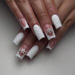 These unique glossy red nails adorned with a bow detail are perfect for a festive Valentine mood. The intricate white bows provide a playful and whimsical charm, making this design suitable for women who want their nails to feel like a gift in themselves. It is better to wear this look with darker outfits allowing the nails to pop up.