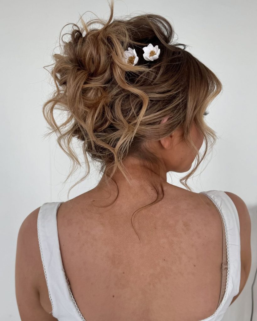 If a bride is searching for an unconventional and unique updo, she cannot go wrong with этим объемным стилем с текстурой, it is literally a dream for her. The natural curls that are loosely attached at the top are not only providing the wearer with extra height but fullness too, thus allowing for the creation of a stunning look that is not very formal at all. It is a simple hairstyle that is best suited for medium or long hair and may be worn both by the bride and bridesmaids. The white floral accents serve to charm the hairstyle with a romantic and natural touch, which makes it the perfect choice for both spring and fall weddings.