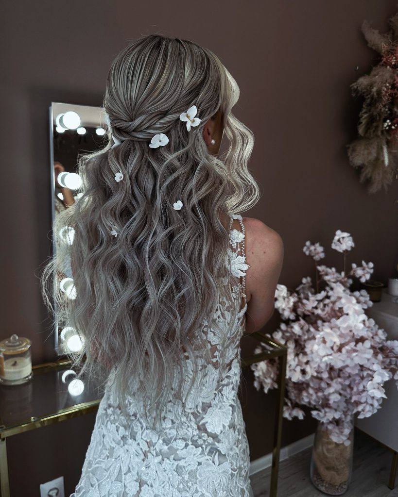 The combination of overtly waved hair and flat-out flower clips results in half up the hairdo’s blending femininity with romanticism. This hairstyle is geared towards medium to long hair strands and specializes in the depiction of the natural texture and volume of the hair, thus forming a fragile, yet solid, shape. The flower clips introduce a dreamy element and make it an ideal hairdo for a garden or outdoor wedding. Wavy strands and the loose hairdo are responsible for the free-spirited charm of the style, which is suitable for brides who want to keep their look easy-going.