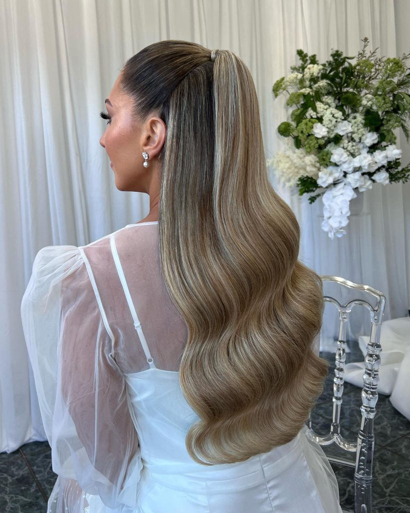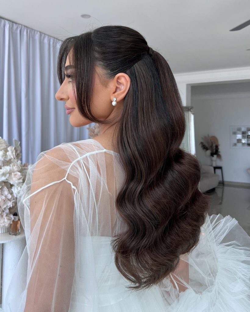 The high ponytail that is held together with a shining style at the top and large glamorous waves that sweep down brings to the viewer a sense of the polished look. This is a perfect choice for a long-haired bride because it provides a classic yet modern look that is suitable for those who like a more structured hairstyle. The location of the high ponytail is not only practical but also adds extra inches, thus elongating the neck and bringing the face into the foreground; this is why it is great for brides who like their hair to be off the face. This style can be further refined with gentle earrings or a stunning veil.
