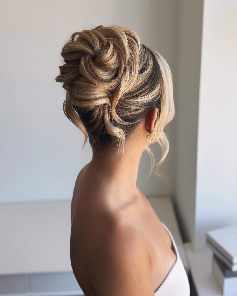 The high and volumetric textured bun is a combination of formal and casual styles, and it is embellished with carefree half-tied strands that create a frame for the face. It requires medium to long hair to perform and is suitable for the kind of brides who are inclined towards a more relaxed bohemian style. The bun packed with volume and texture looks absolutely like nature has zero effort to achieve it. This style is well harmonized with earrings or flowery hair ornaments as it is suitable to wear for different types of wedding ceremonies.