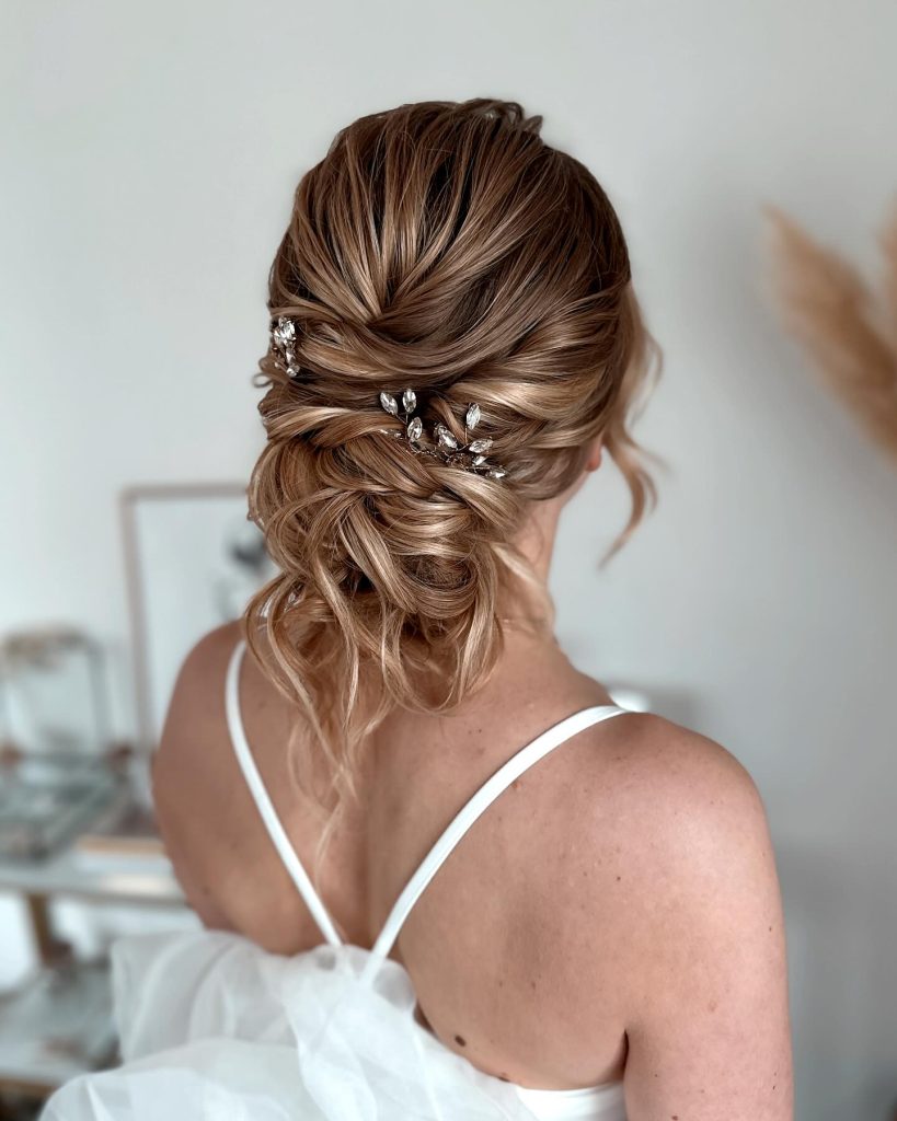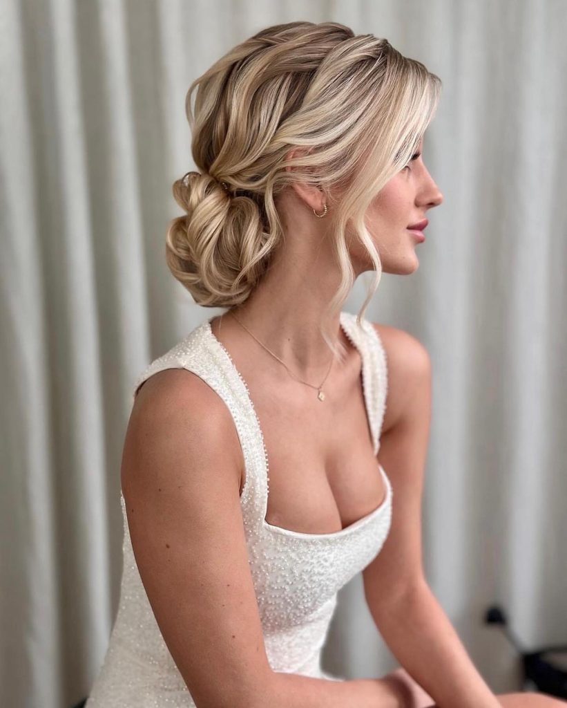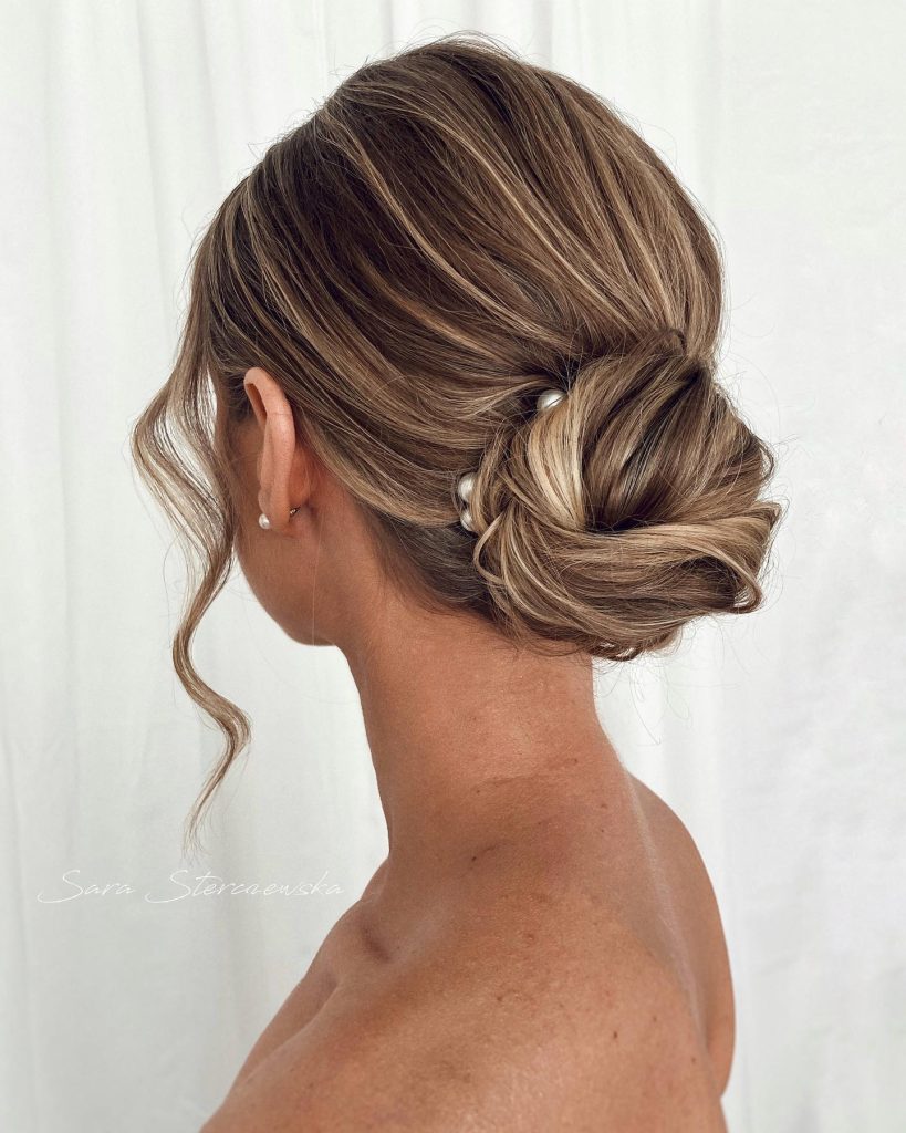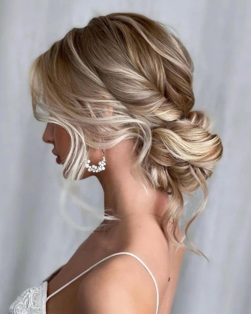 This haircut is a great pick for all brides who want to wear an updo that is simple but still modern. The low bun has some loose, random curls placed in it with some bobby pins, creating a light, textured, sophisticated, and romantic look. The hairstyle is suitable for medium-length and long hair, and it can be worn with earrings or other jewelry that complement its refined look. For brides wishing to wear a veil, this updo is a perfect foundation to anchor the veil firmly.