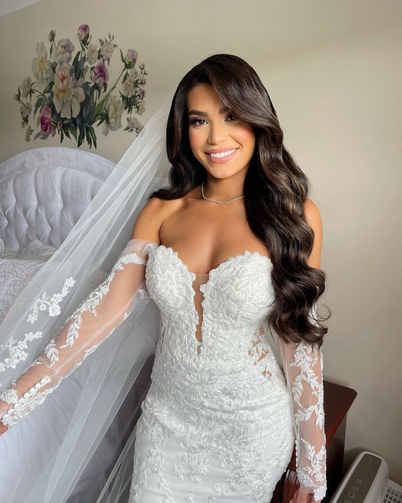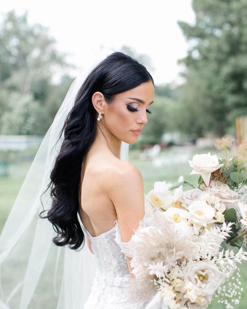 The hairdo is all about neat, shiny waves that fall smoothly down the back of the bride. The central parting style of this look is so discreet that it emphasizes as well as takes away from attention, thus making it the perfect hairstyle for long hair. Along with the veil, it is a perfect match for a timeless and bridal look that feels both contemporary and traditional. The straightforwardness of this hairstyle makes the bride’s natural beauty the center of attraction, which is why it is a good option for minimalist brides who are after an elegant look without extra embellishment.
