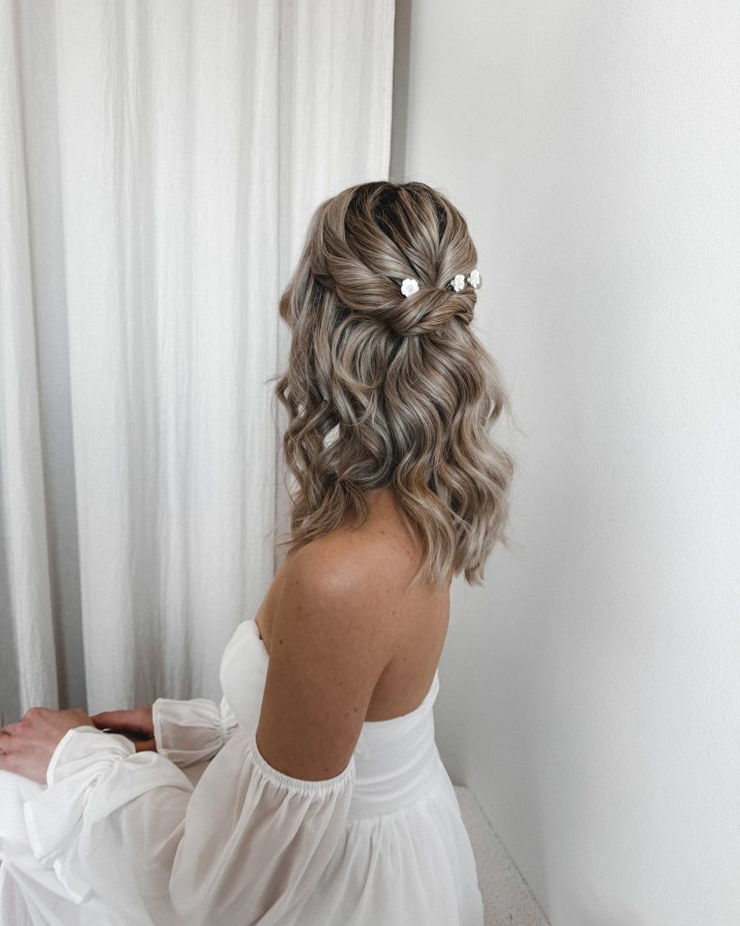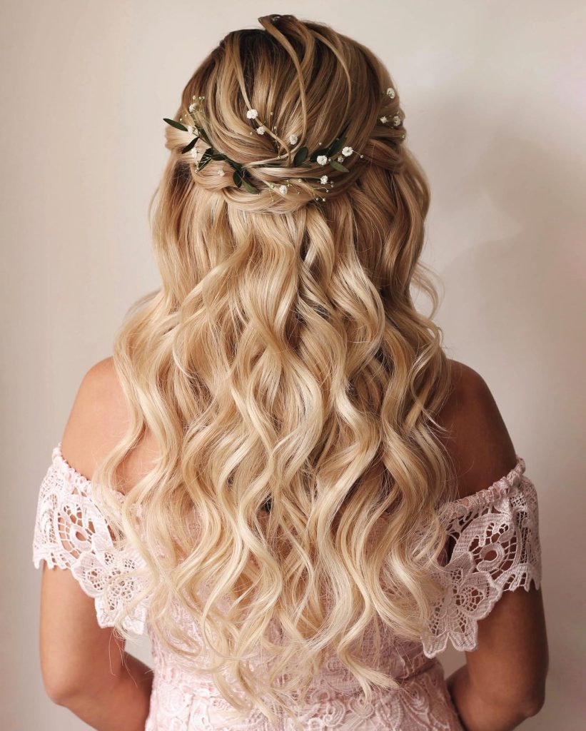 14. Half-Up Wavy Style with Baby’s Breath Accents