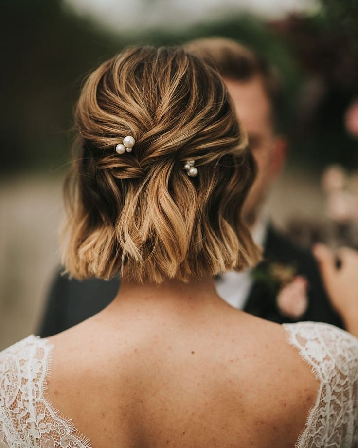 Ideal for short hair, this half-up style is further embellished with tiny pearl pins, which infuses the hairstyle with a hint of charm and elegance. The hair is gently twisted in the upper head’s crown, including the structure and volume, while the ends hang down freely to add more naturalistic and soft sense. This style is a perfect alternative for brides or bridesmaids with short hair keeping it simple yet trendy. The pearl accents are a sophisticated addition that ensures the hairstyle is suitable for both indoor and outdoor weddings.