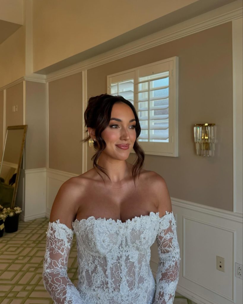 Delicate visible curls mention the face while this gentle, romantic low bun is in a soft, romantic. When the curls are pinned loosely, they create a natural yet elegant look thus making this hairstyle a great choice for brides who prefer a relaxed yet sophisticated style. It can be worn with medium length or long hair, and it looks great with lace dresses or vintage-inspired gowns. A veil or flower accessory would bring in the romantic element, this attire becoming classic and adaptable for both spring and autumn ceremonies.