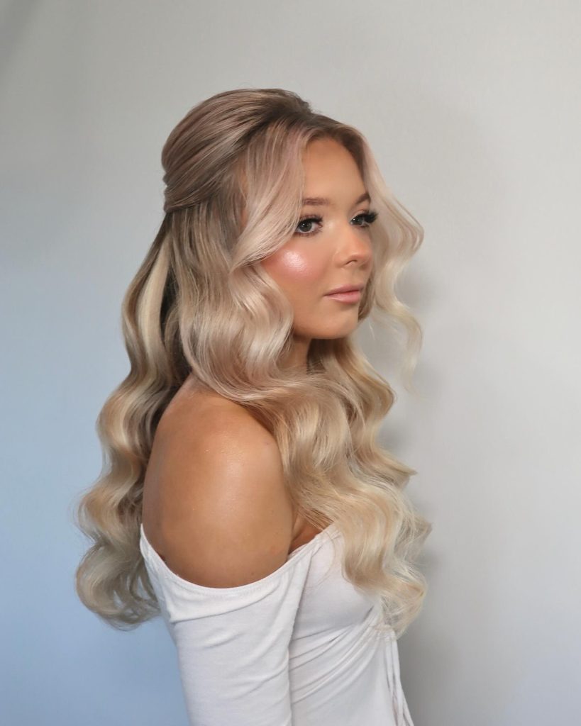 The exquisite half-up hairstyle is a fusion of classic glamour and modern elegance, which adopts a more structured look. The hair is brushed back smoothly with retro waves flowing down, which is a classic look that symbolizes a polished appearance and is excellent for a bride who is looking for something chic and uncomplicated. This side part style is great for girls with shoulder to long hair and also flatters different face shapes. Wearing this hairstyle with pearl earrings or a veil will tremendously increase its look of being sophisticated and charming, hence, it becomes a good choice for brides, who like the ideas of old Hollywood,.