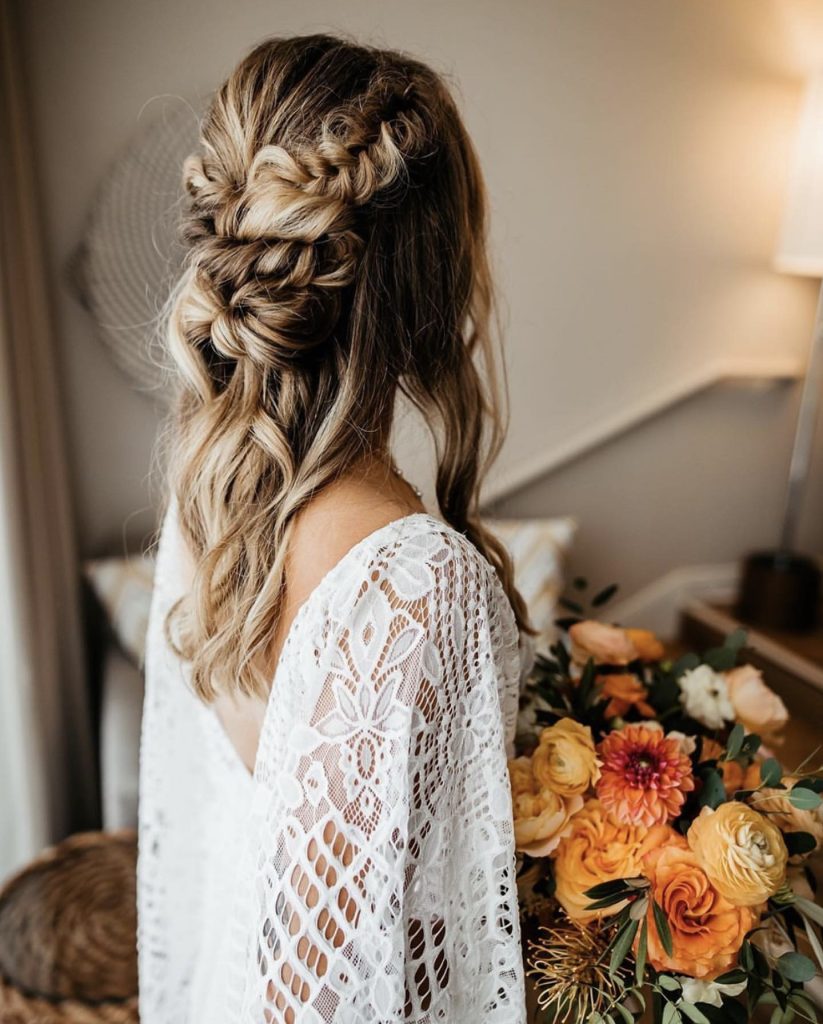 The timeless half-up, half-down design which is a half bucket, and half of one’s shoulder style of this hair has the volume of curls that are loose and is the most popular answer to the cascading water effect . It is the best option for the brides who have long hair and want to wear their hair simply but gorgeous. The waves that are added in the style, together with the weight that is at the top, create a halo effect so that the bride will be looking for something ageless. Accompanied by the off-the-shoulder dress, this hairstyle can be augmented with flower or jewel ornaments.