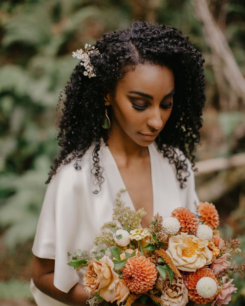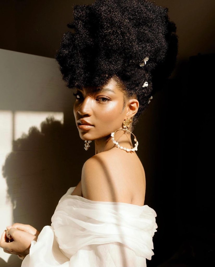 This curly updo that very much looks like the curly updo is in fact the style that uses the natural curly hair. The addition of the tiny flower was a great move to bring this hairstyle to life, thus it gives the impression of both a romantic and a queenly style, making it suitable for brides with curly or afro-textured hair. This updo is a perfect choice for those ladies who not only want to express their natural hair but they also want to be flower girls with a dash of style. The stature and the volume, of course, make it the perfect piece for brides who want to say ”yes” in a clear-cut but bold way.