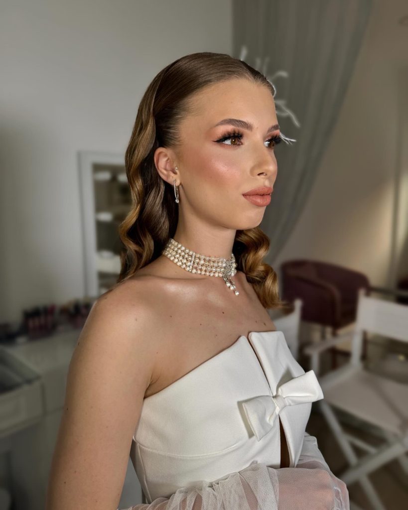 This hairstyle is a great way to achieve the vintage Hollywood glamorous look with the waves that are styled perfectly and a middle part. Whether you have long or medium-length hair, this hairdo gives you a chic, classy, and timeless finish. The waves are sleek and well-defined, giving a nice texture that can be paired with bold makeup or vintage-inspired gowns. This style is particularly fitting for brides who want to reflect a touch of romantic and classic elegance on their big day. Wearing it with eye-catching earrings or a veil not only gives the original idea additional charm and beauty but also sets the tone for a real star look.