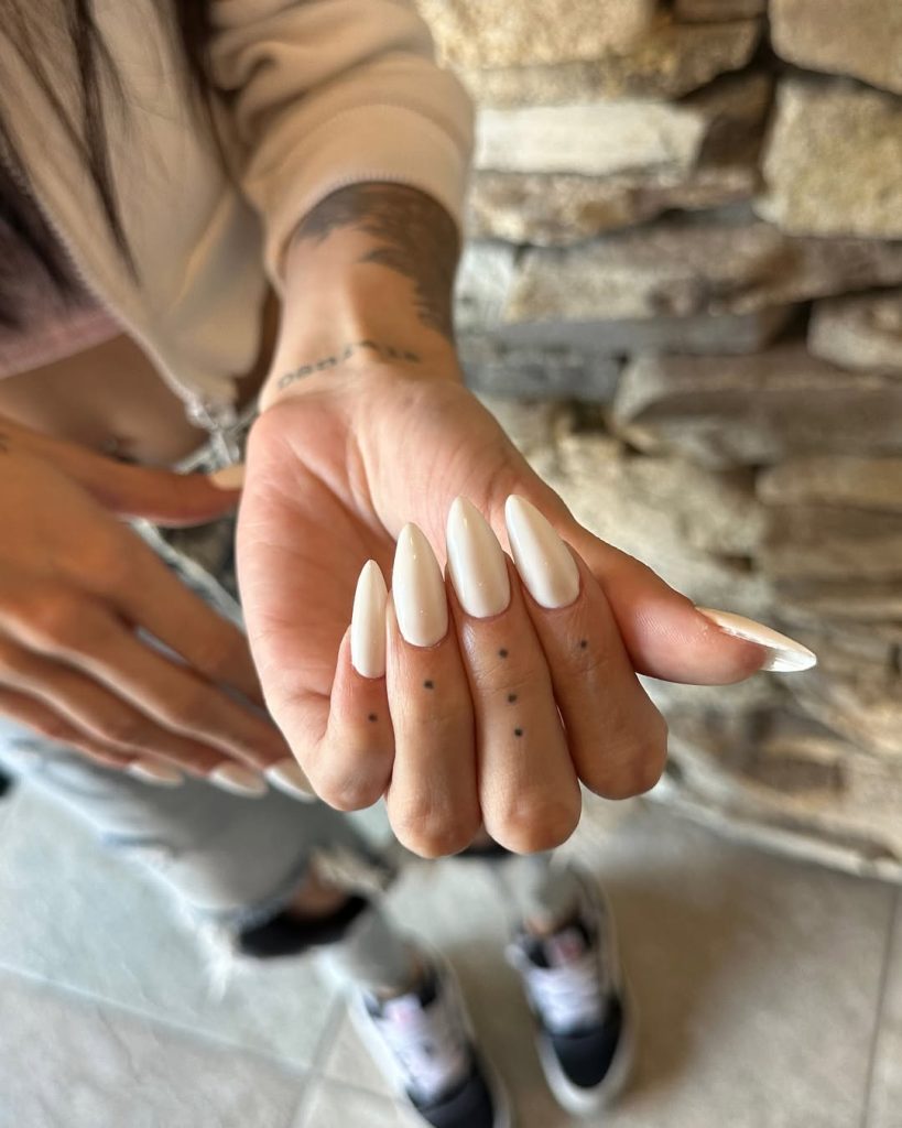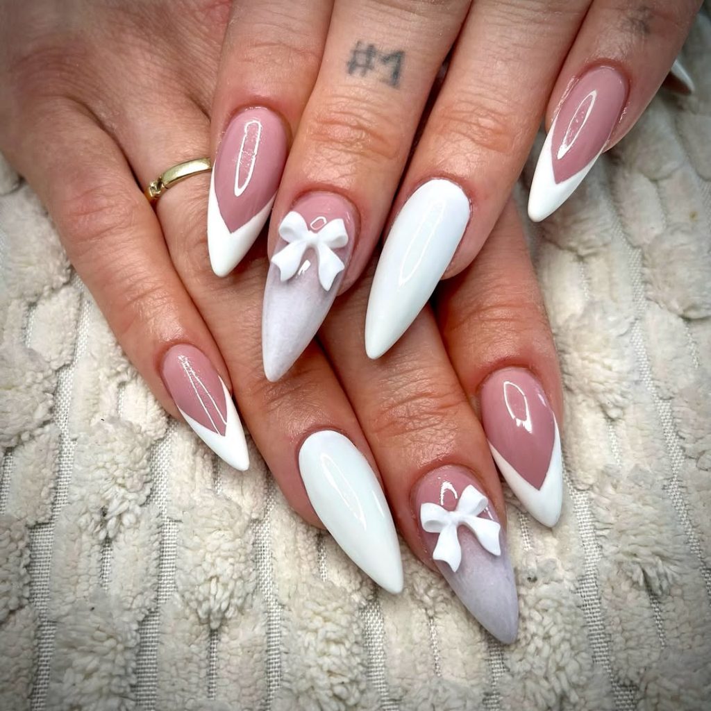 There is something about these Almond White Nails that is playful yet chic to the core with the bold tips and subtle bow details. The combination of fine nude polish, edgy white dots and 3D bows leave them somewhere between dreamlike and playful. This looks like a bit of a Y2k and it looks like a runaway moment of fashion but not too over the top.