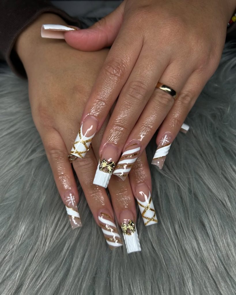 One can only imagine, that holiday magic can be bottled up and would resemble these White Nails with the gold lines, snowflakes, and small winter charms. The elaborate stripe patterns and glitter finish gives the appearance of gift wrapped packages on a Christmas tree. It is joyful, hot, and lively–just how one should start 2025 trends in style.