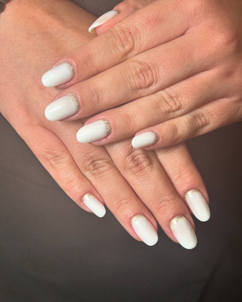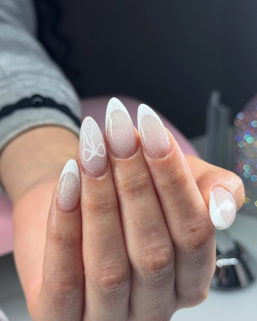 These French-inspired White Nails are sprinkled with glittering polish and a string of bows design. The almond tips are feminine and graceful, and the glitter brings some winter shimmer. It has that cool, glam edge on a classic style; in one word it is polished and playful.