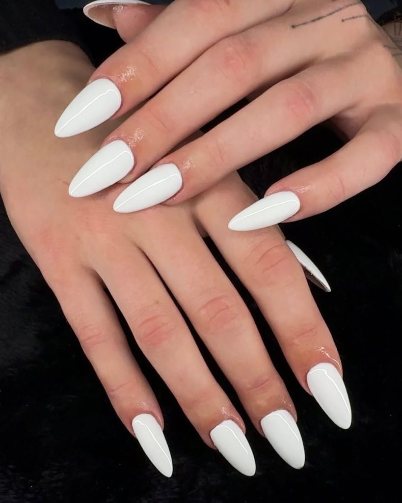 These White Nails are all about sleek simplicity. They make a statement with their long shape resembling an almond and shiny polish creating a sophisticated feel with ease. They are sophisticated yet at the same time not trying so hard to be like that- they are the ideal white dress that never fades- it is always in fashion. Classic, timeless, and versatile.