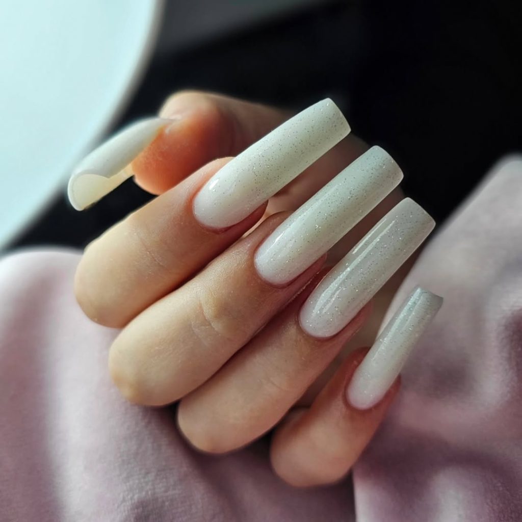 These White Nails are available in long round-toe coffin shape with a hint of sparkle that creates a dreamy balance between clean simplistic techniques. Their soft gradient and a sprinkle of glitter makes them appear icy and elegant, like the fresh snow at twilight. Extremely bold in length, with delicate design, they turn out to be a good combination of drama and grace.