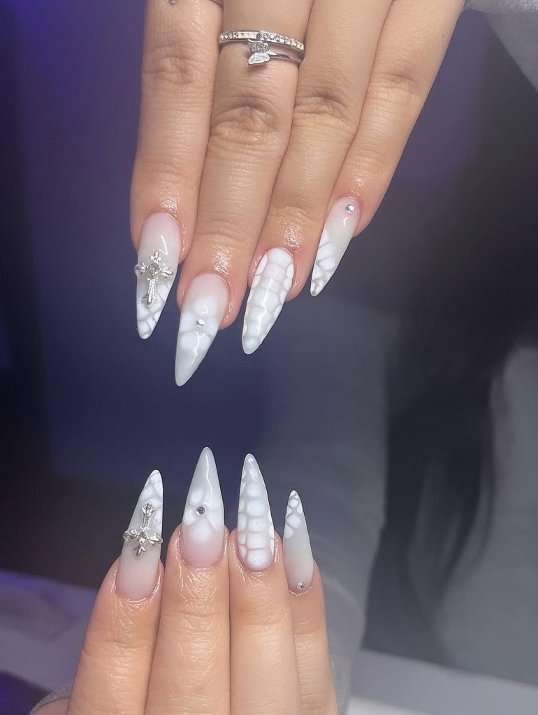 These White Nails feature half matte and half gloss polish, 3D textures and tiny silver charms in a striking combination. The combination of smooth gradients and raised details make them look artsy and playful, edgy, yet feminine. They are rather daring but classy enough to be sure of a fashionable woman on the go.