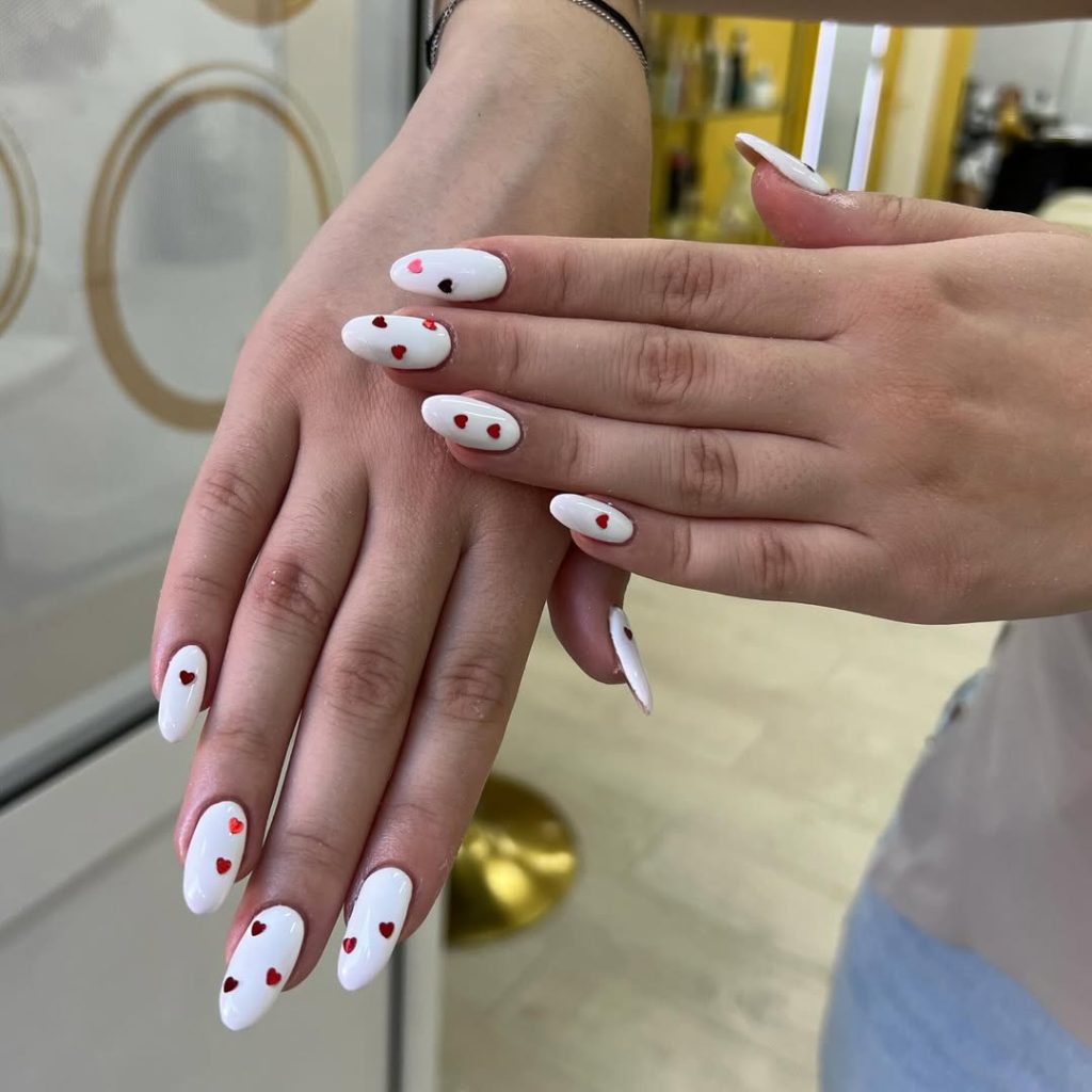 Romantic, cutesy, and a bit mischievous – the red-and-white-polka-dot nail design is your fingertips love letter. The red and pink hearts on the clean white base are delightful, making this manicure feel sweet, romantic, and appropriate of the heart -dropping season or any other day you want to say you love them.