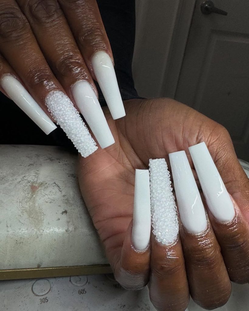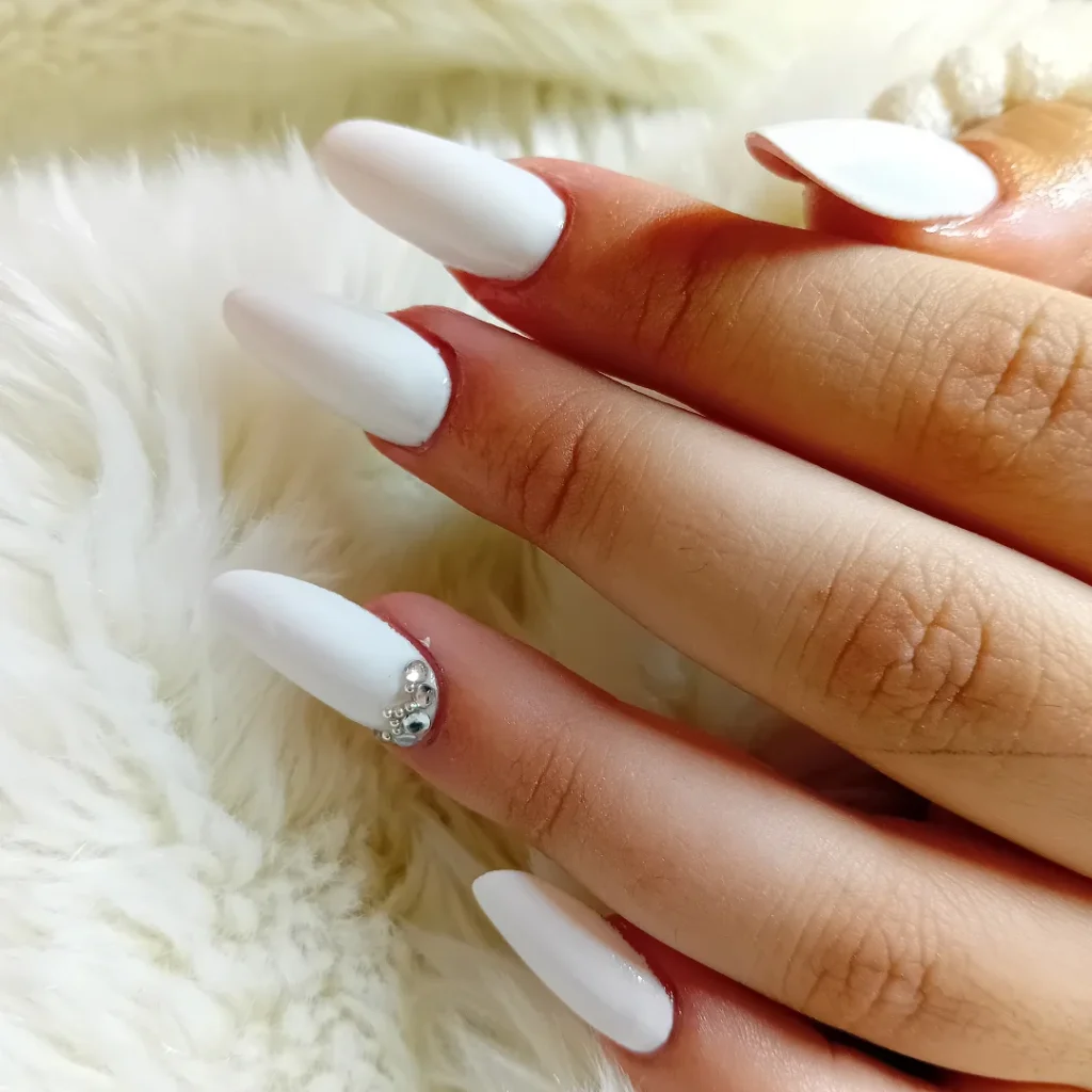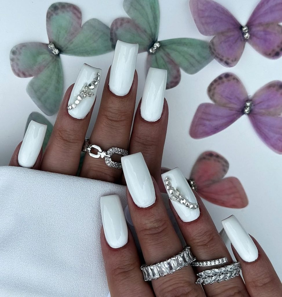 There’s something undeniably bold about these White Nails. Their long square shapes are a statement in and of themselves, but then they go a notch higher with the designs made of rhinestones. They are shiny, fashionable, and that perfectly balanced blend of elegance and fun- like a bit of indulgence within reach.
