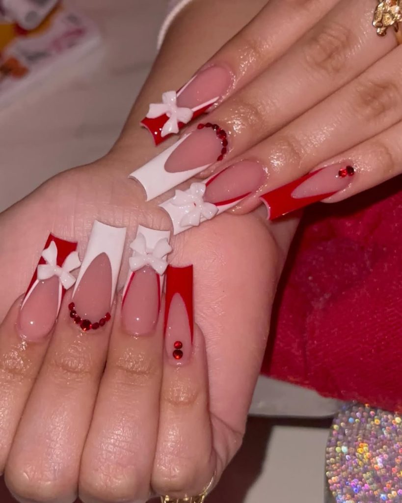 This appearance suits ladies that are fond of voluminous polish concepts. The red and white combination makes it fashionable, and the charms provide it with a twist of individuality. It is particularly enjoyable at winter event types or parties where your nails have an opportunity to match your outfit, in splendor.