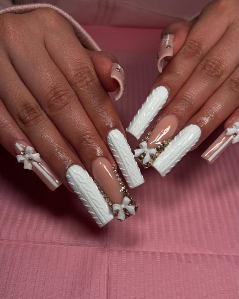Snuggly and glam at the same time, these White Nails incorporate a knit sweater-inspired design, fun-sized bows, and glittering gold trimmings. They evoke the greatest winter flair with a trendy elegant touch, leaving them cozy and elegant.