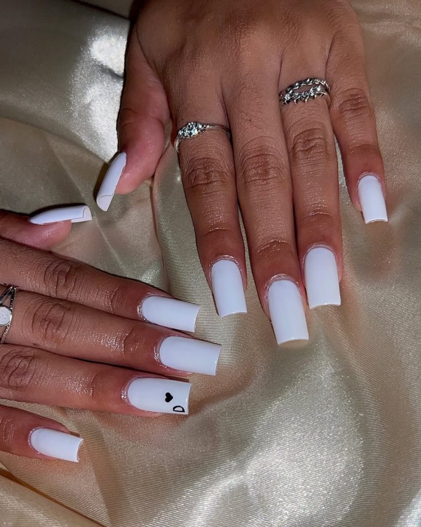 These White Nails are clean and cool in a streamline square cut with a little red heart icon. As an abbreviation, the minimal design is playful yet not too overboard on its elegant aspect It has classic polish but then it gets people to look twice due to the little surprise.