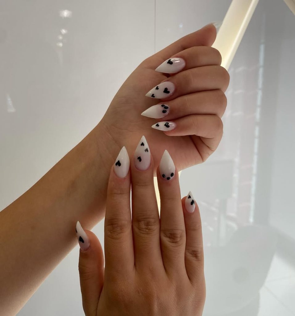 Cutesy and daring, these White Nails are spread with black hearts that make a bold and stylish effect. The almond shape is classic enough to be elegant and the monochrome appearance makes them trendy and versatile. They feel cute and at the same time confident.