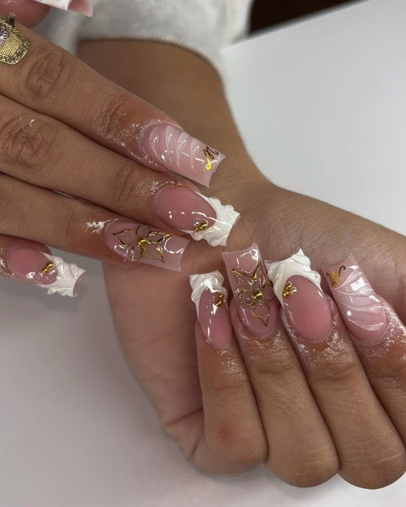 Ideally suited to people who love fine detail designs, these square nails will retain their shape and are perfect when it comes to creating layers. Pink and white colors with gold and details work harmoniously with the 2025 trends, where the accent is going to the textured and artistic nail design. The ideal colour to wear to special occasions, or occasions when you want the nails to shine among the rest.