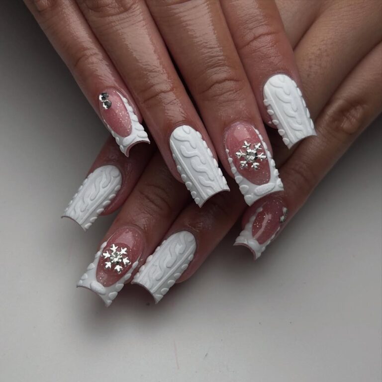 These White Nails embody all the autumnal warm coziness with the cable knit sweater touch and graceful snowflakes. The high-rise 3D design has the same comfortable effect as wearing a favorite knit cardigan, but makes your outfit look very cozy but stylish and very holiday-like at the same time. It’s playful, creative, and so perfect for cold-weather charm.
